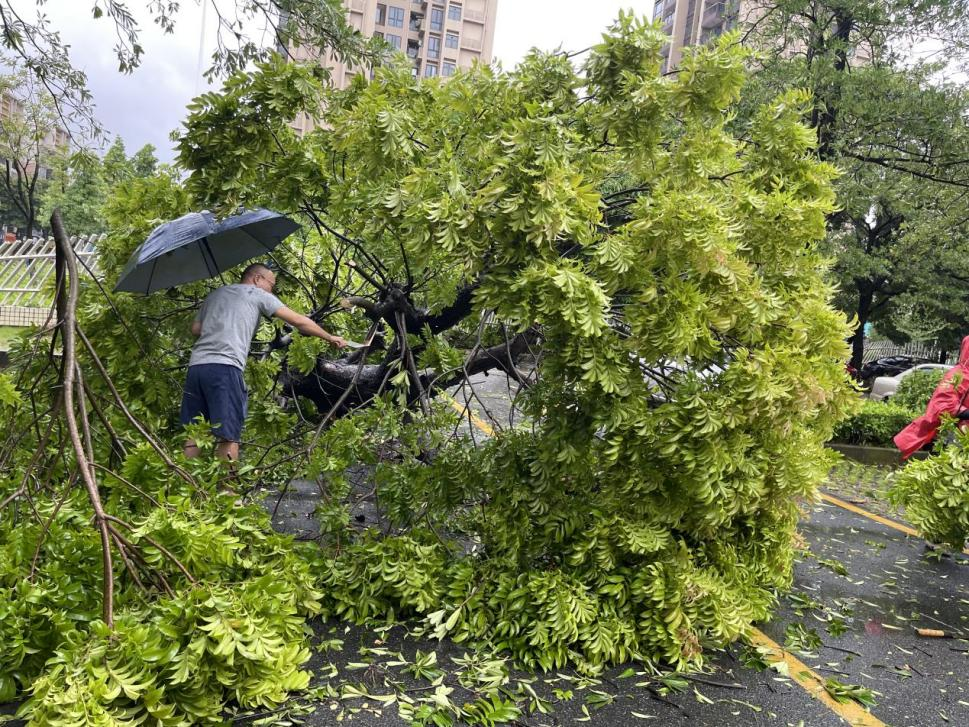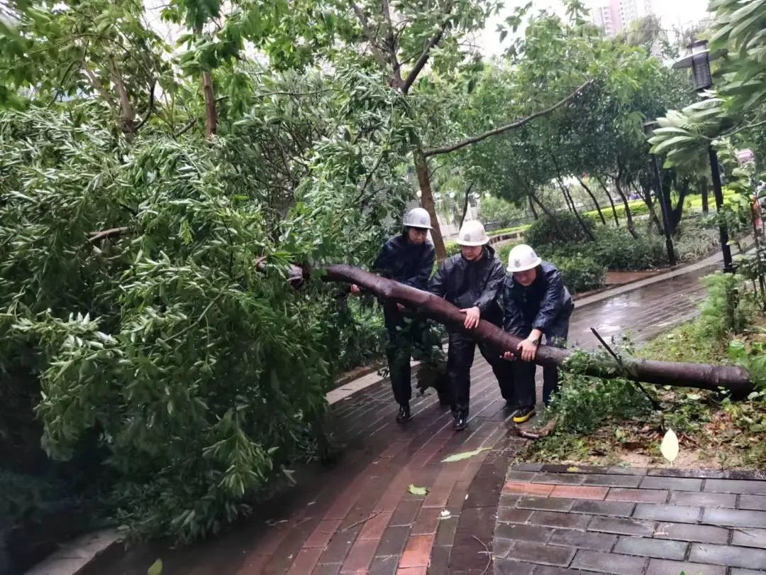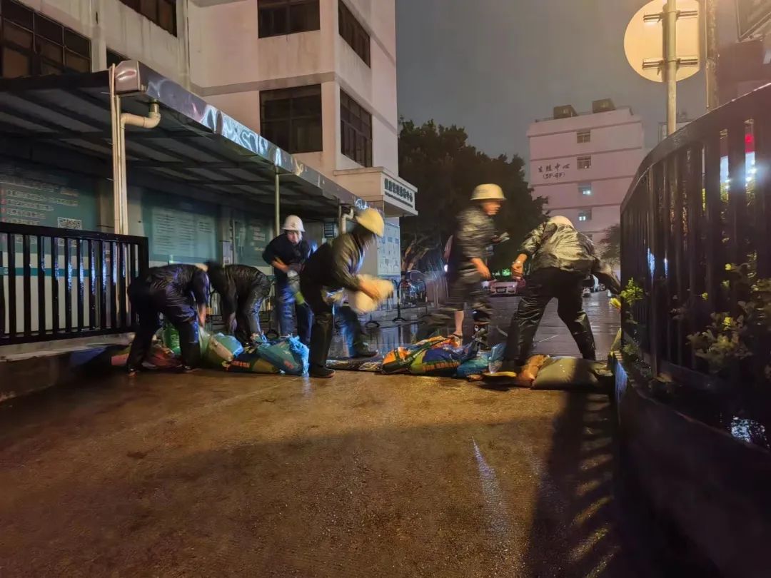 凌晨台风登陆后,值守人员顶着大风大雨紧急处理倾倒树木,确保生命通道畅通。为防止负二层重要设备水浸,后勤及保安部门凌晨堆砌沙袋预防雨水倒灌。