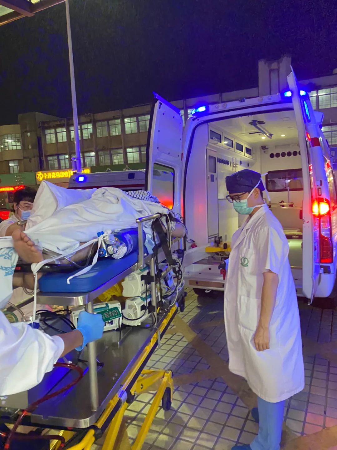 9月1日晚上7点全市“五停”的时刻,中山市人民医院ECMO中心接到陈星海医院求助电话:一位心梗术后出现心衰的患者急需 ECMO支持并转运。ECMO小组值班医护王琪、谭敬淘、陈晨与急诊护理顶着强风紧急出车,晚上11点顺利将病人转回。