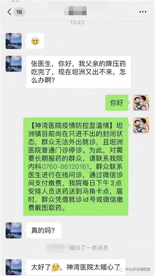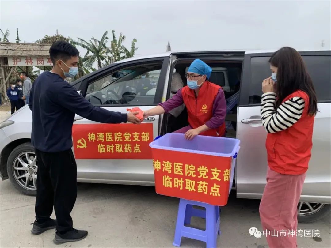 由于坦洲实行只进不出的封控措施、医院普通门诊停诊,神湾医院推出一系列暖心服务:对长期需要服药的群众线上问诊,并在每日固定时间把药送到固定关卡点,群众凭就诊号或缴费截图,不用出封控区就可以取药。对无法自主去的坦洲出院病人,专车送至关卡点,联系家人接回。