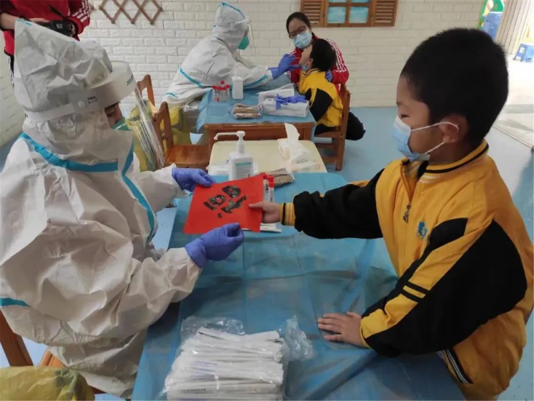 做完检查的小朋友给采样员送上“小心心”和自己写的福字。