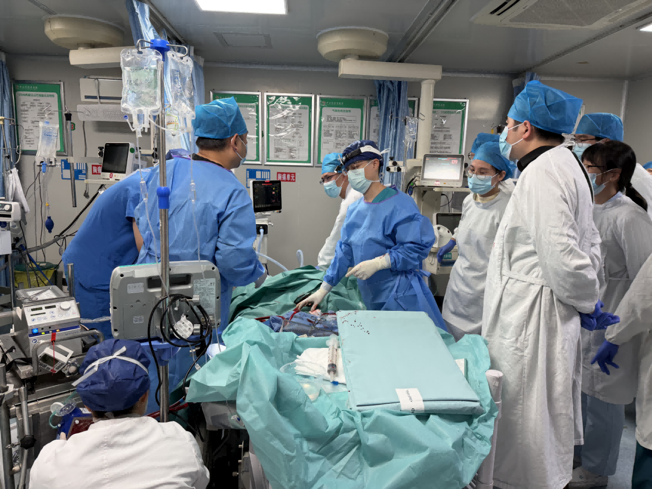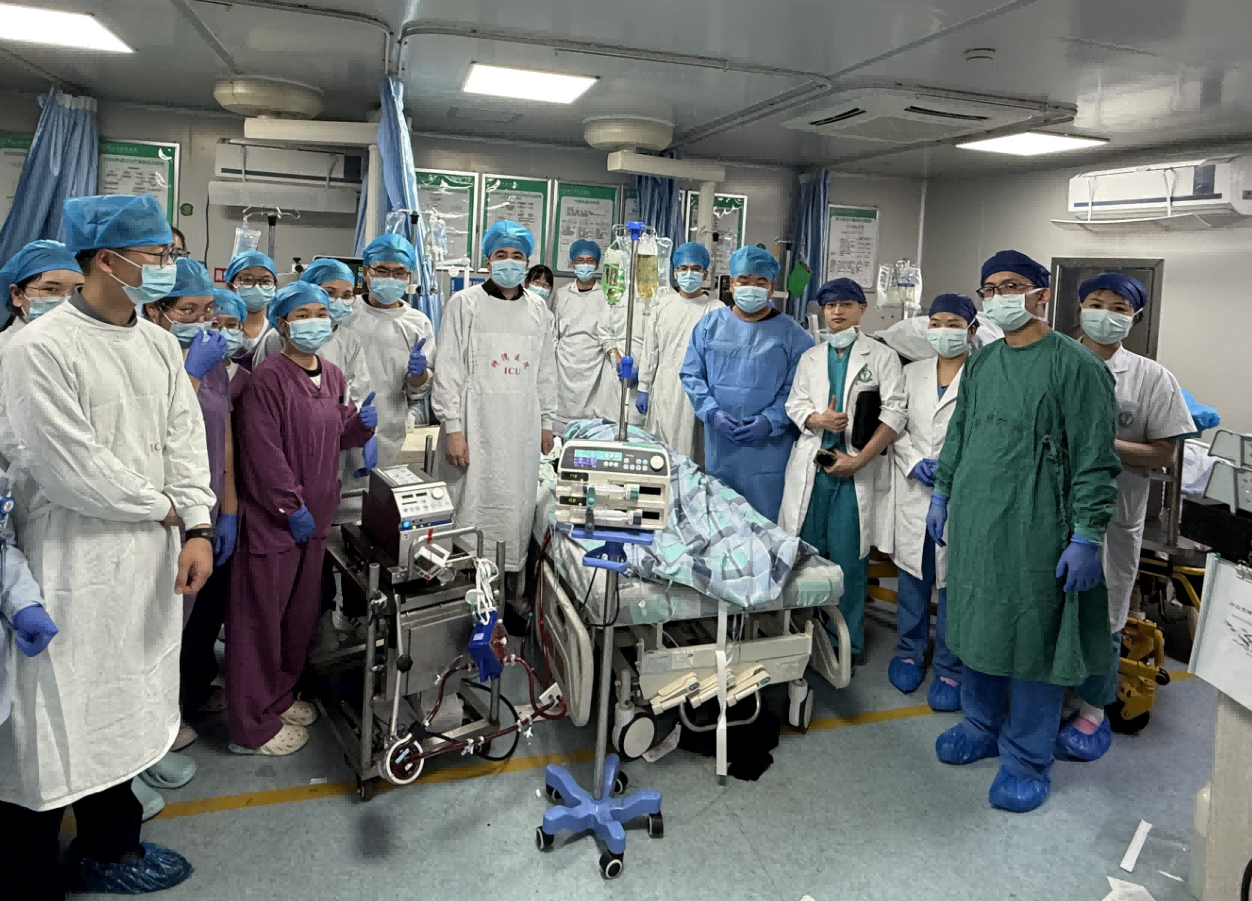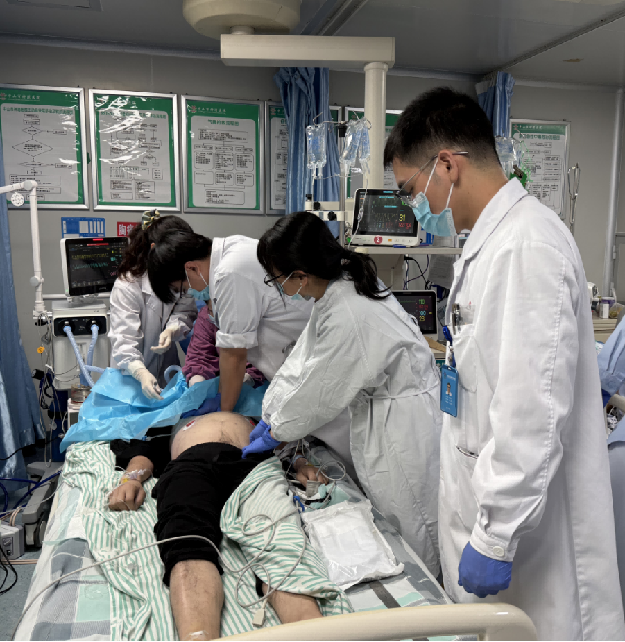 与此同时,我院第一时间启动医联体应急联动机制,紧急联系医联体单位——中山市人民医院 ECMO 团队。人民医院手术麻醉科主任廖小卒、ECMO研究室负责人王立强带领团队迅速响应、火速抵达,凭借专业技术与丰富经验,顺利为患者实施 ECMO 体外生命支持。