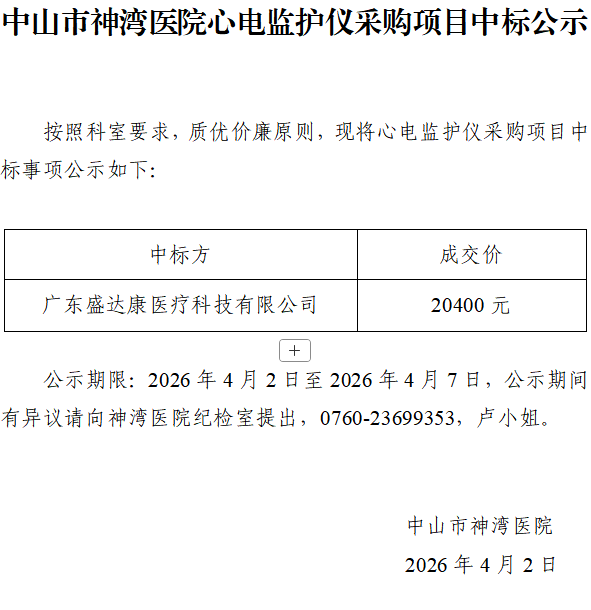 中山市神湾医院心电监护仪采购项目中标公示